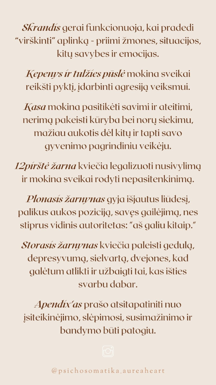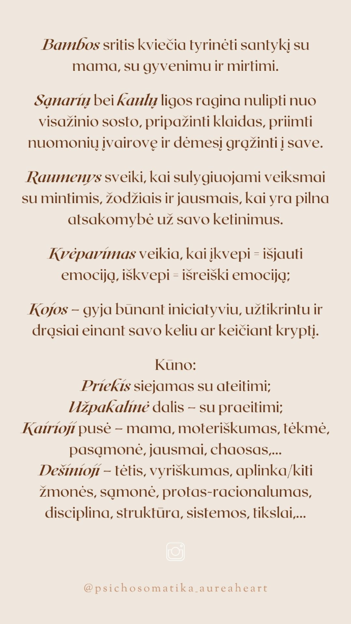 Kūriau su idėja, kad po ranka turėtum esmines kūno organų bei dalių siunčiamas žinutes, kurias kalba Tavo kūnas per (nemalonius) fizinius pojūčius ar simptomus. Kad įprotį griebtis vaisto pakeistų įprotis grįžti dėmesiu į kūną ir į sąmoningą veikimą = S⇆VEIKIMĄ®